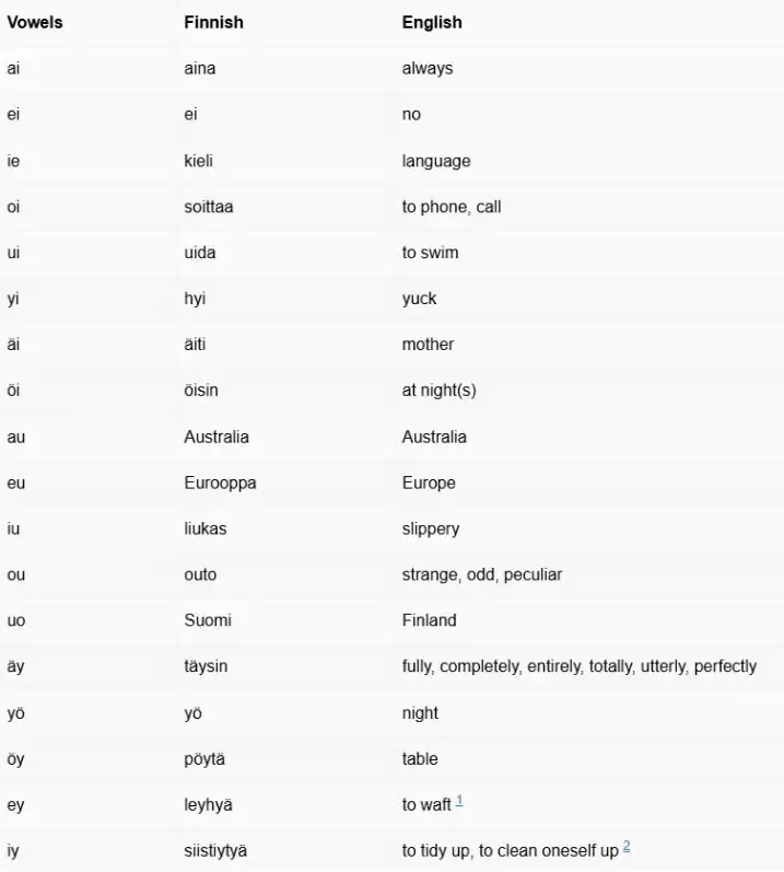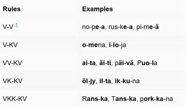 Trong việc học phát âm, V là viết tắt của vokaali (nguyên âm) và K là viết tắt của konsonantti (phụ âm), từ đó ta có các quy tắc cơ bản sau: