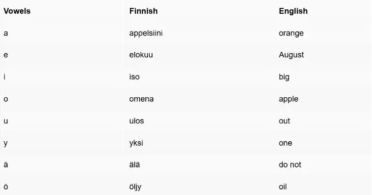 Nếu độ dài của một nguyên âm ngắn (hoặc đơn) là V , thì độ dài của một nguyên âm dài (hoặc đôi) là V * 2. Ví dụ, chữ a trong từ appelsiini được phát âm là /ɑ/, và chữ a đôi trong aamu được phát âm là /ɑː/.