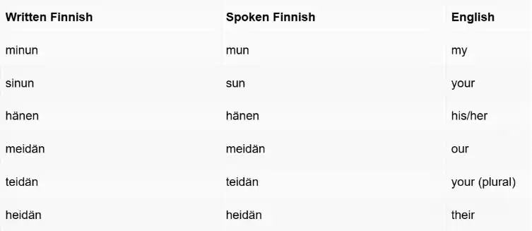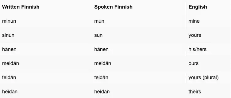 Trong tiếng Phần Lan, đại từ sở hữu và tính từ sở hữu được viết giống hệt nhau. Ngoài ra còn có đại từ chỉ định, đại từ tân ngữ, và phụ tố sở hữu.