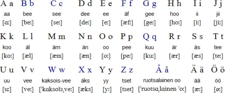 Bảng chữ cái tiếng Phần bao gồm 29 chữ: 20 chữ chính, còn lại là chữ vay mượn (b,c,f,g,q,w,x,z,å).